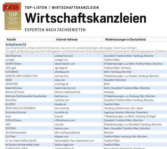 Ich freue mich sehr, dass nach der Auszeichnung in der Wirtschaftswoche meine Kanzlei im Handelsblatt-Ranking „Deutschlands beste Kanzleien 2025“ (Best Lawyers) sowie im Magazin „Focus“ als „Beste Wirtschaftskanzleien“ im Bereich Arbeitsrecht ausgezeichnet wurde.